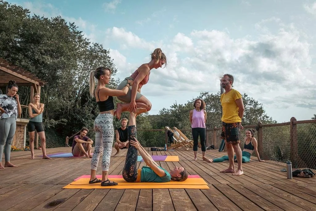 Each day begins with aerial yoga to wake up your body and senses. Then we dive into AcroYoga workshops guided by the amazing Mira and Manas—both certified TheAcroWay teachers who share their passion with clarity, creativity, and lots of joy. Expect a mix of flows, balances, partner games, and cool transitions (plus plenty of laughter!). We’ll also explore Thai massage, hang out at a secret beach, and come together for a cacao ceremony and bonfire under the stars. Move, connect, and recharge with us in nature—and leave with a strong body, an open heart, and memories to carry home.